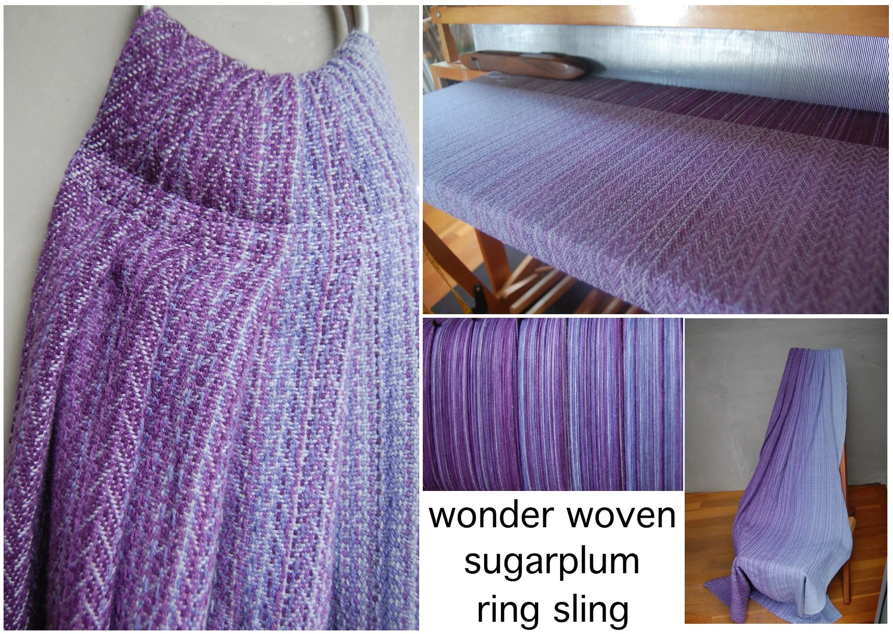 The wonder woven page has reached 2000 Likes! Thank you to everyone who has shown an interest in my wraps. I love that your excitement for wearing them matches mine for weaving them! To show my appreciation, I am holding a drawing to give away a ring sling made from the sugarplum warp. This was woven in a pointed twill variation with a cottolin warp and a silver cotton weft. It measures 75" from the rings, weighs approximately 285 grams/m^2 and features hemmed rails. The ring sling was sewn into a pleated shoulder by Sleeping Baby Productions. Please note: this was made from a piece with a tie-up error. You will notice longer floats on one side - this is a cosmetic flaw that does not affect the integrity of the carrier.