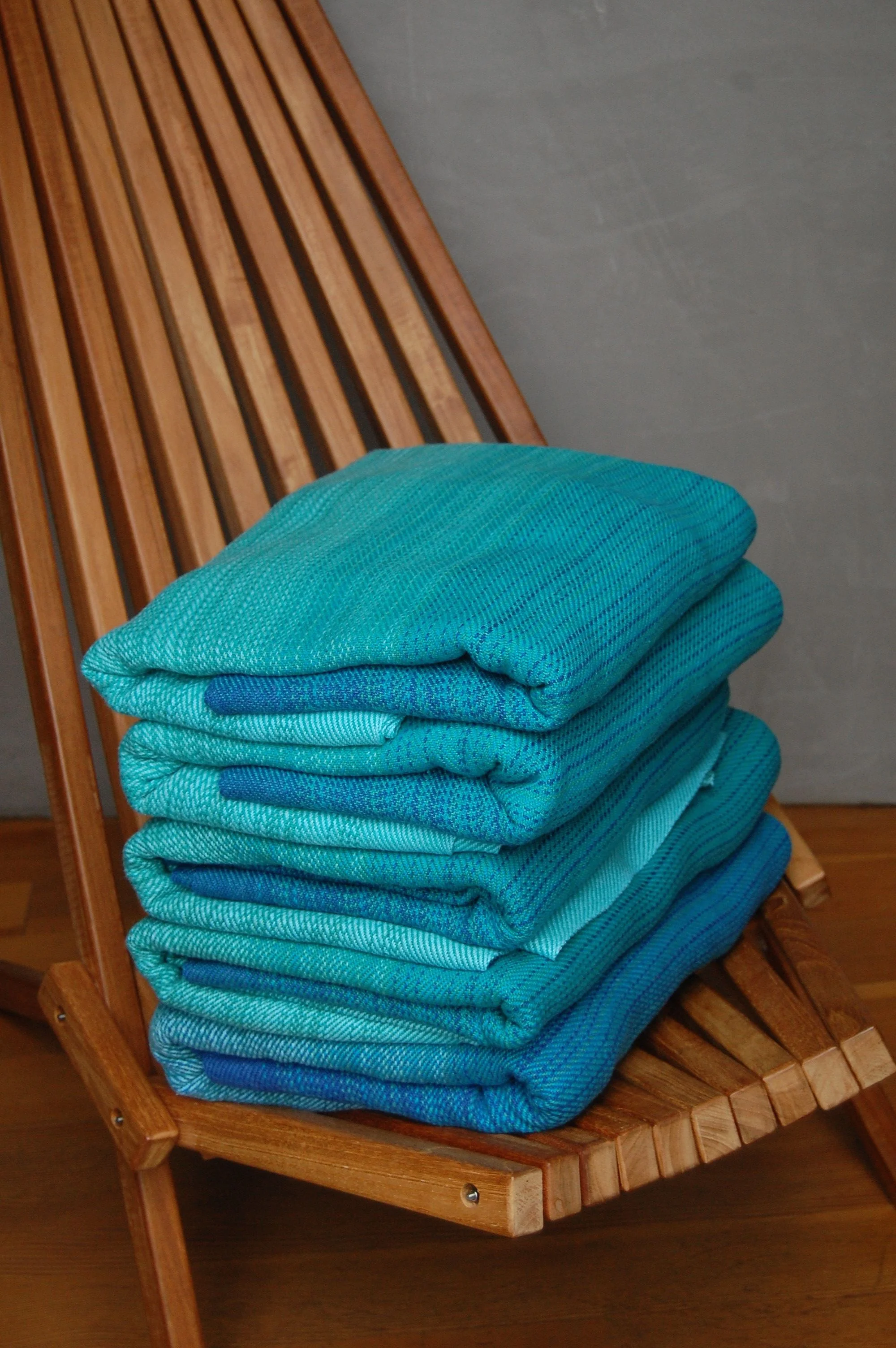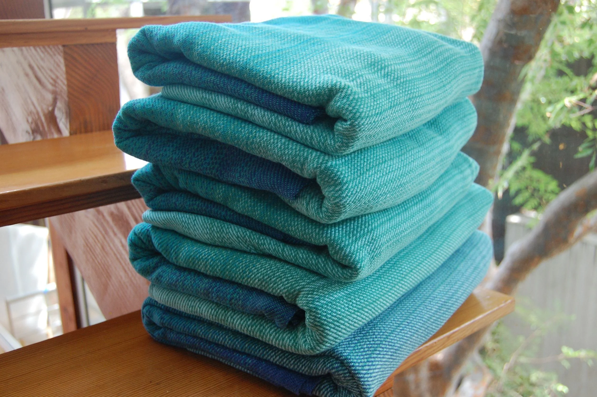 The warp is Egyptian Cotton. Below are the wefts and lengths that will be available. In each case the color weft is Natural. The wraps with Egyptian Cotton weft weigh approximately 347 grams/m^2 and the hemp blend weighs approximately 353 grams/m^2. Each features a hand-embroidered middle marker.