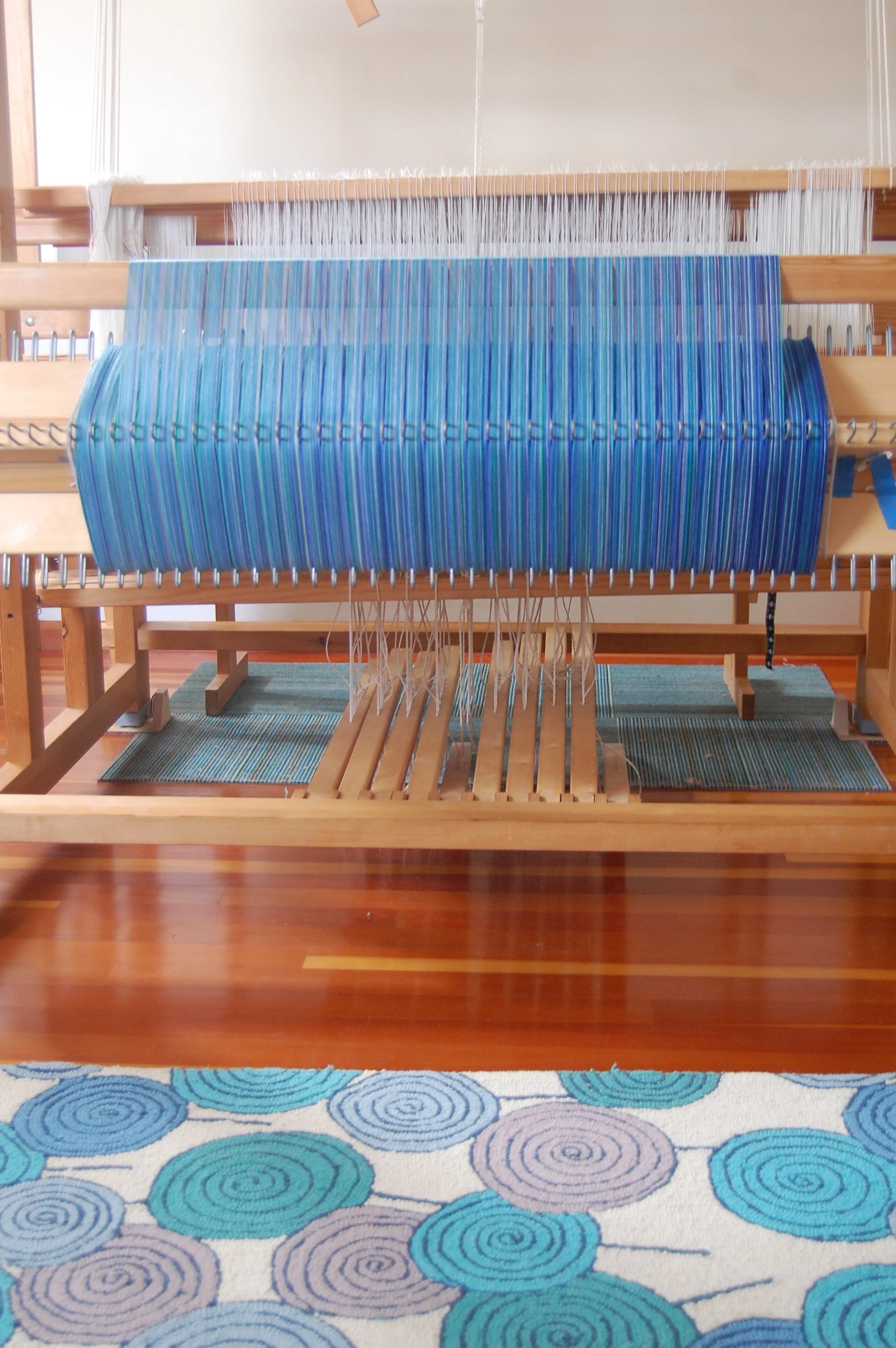 The big loom has got the blues. This warp, as yet unnamed, combines a subtle blue gradation with a lively mix of green, blue-green, and silver yarns. It is approximately 75% Egyptian Cotton/25% Cotton. It will be woven in a pointed twill variation. I have some really amazing weft yarns I've been saving up just for this!