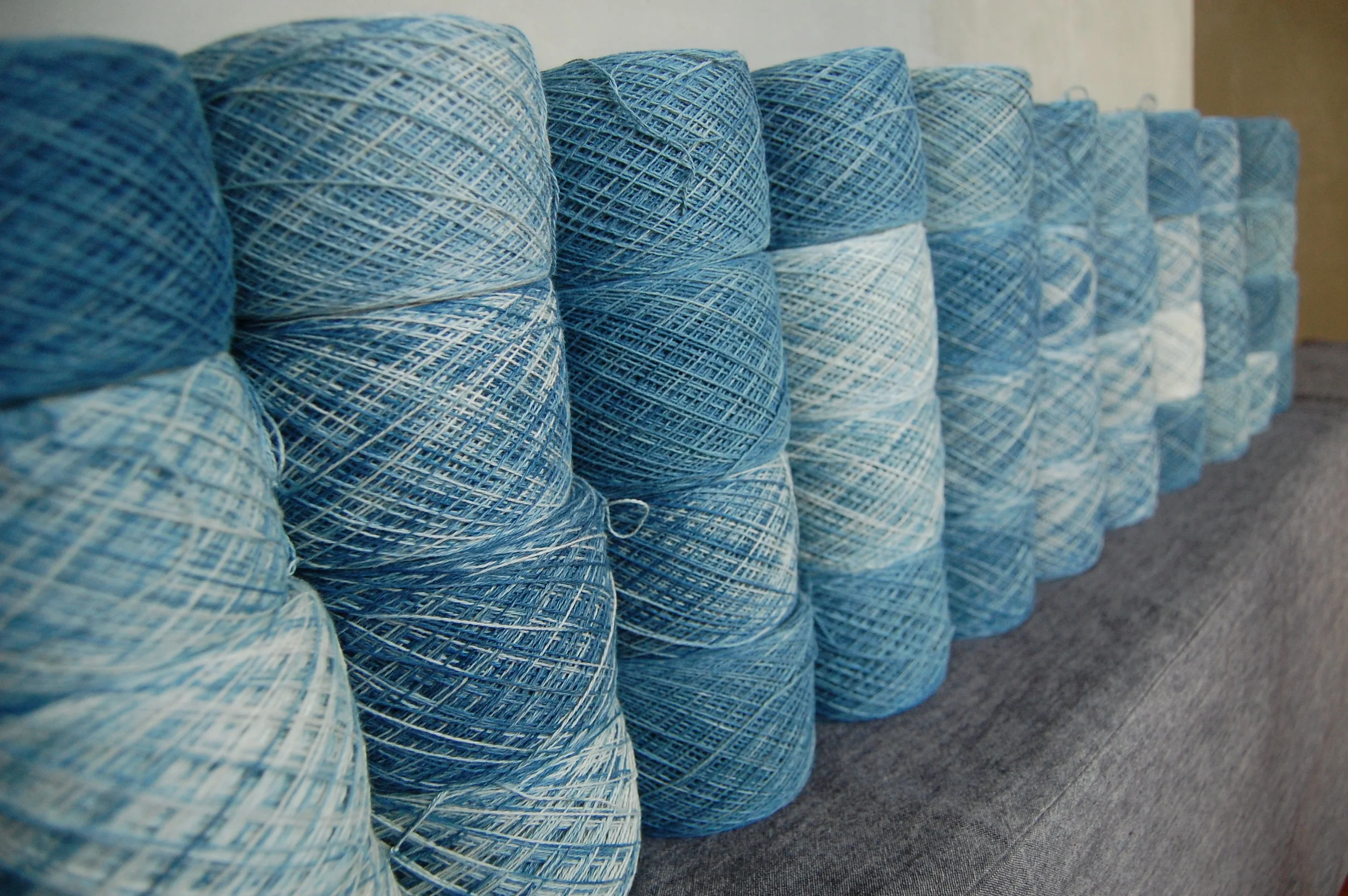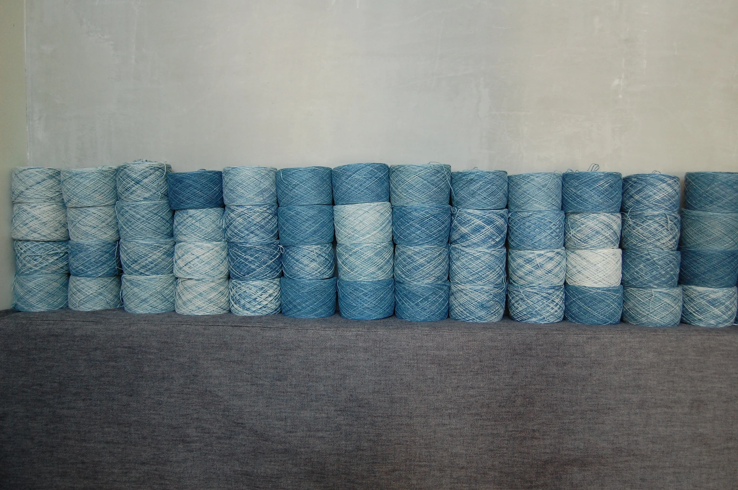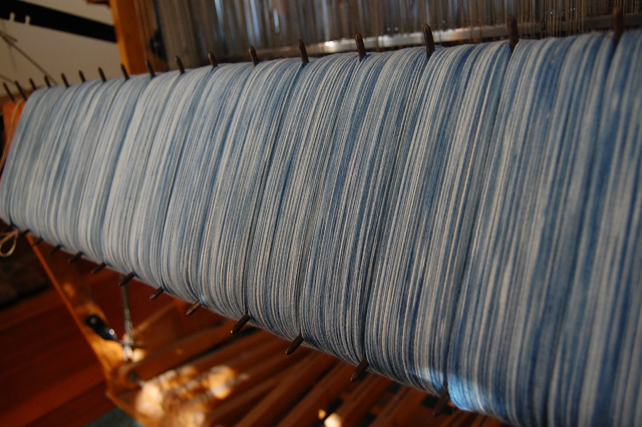 I've made a lot of progress with the second organic indigo-dyed warp! If you missed version 1, you can read about it here. For this one, I started with 10/2 Organic Upland bright white combed cotton. Like v.1, it has been dyed in small organic indigo vats over several weeks - allowing the vat time to rest between sessions. The warp has a full range of blues and a lovely contrast with the bright white bits that were left un-dyed.